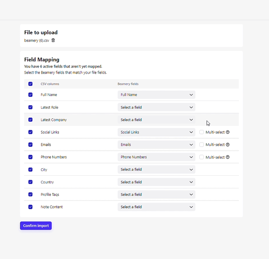 - Once you have uploaded your formatted .CSV file you will map your data fields on the next page. To delete your uploaded file, simply click the trashcan icon next to the file name. Beamery will attempt to map your fields automatically, but you will need to complete the mapping before you can confirm the import.
