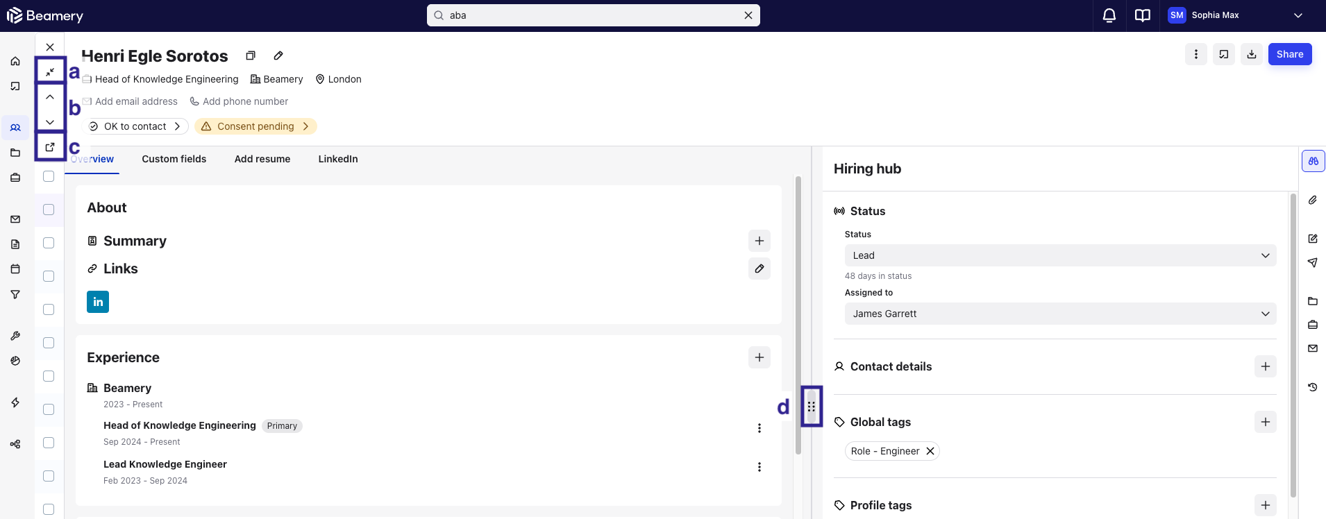 The Smart Profile has controls for customization and accessibility built in. Collapse or expand the profile to full screen (a), navigate to the next or previous contact (b), open the profile full screen in a new tab (c), and control the size of the Workspace tools (d). Set your preferences for the Smart Profile and Beamery remembers your choices for your entire session.