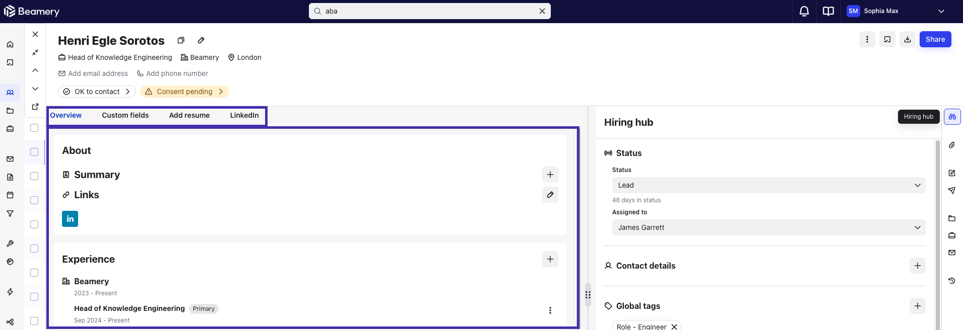 - Share and collaborate: Collaborative recruiting has never been easier. The Overview tab lets you easily share candidate profiles with your TA colleagues and Hiring Managers, fostering seamless collaboration and ensuring everyone is on the same page.