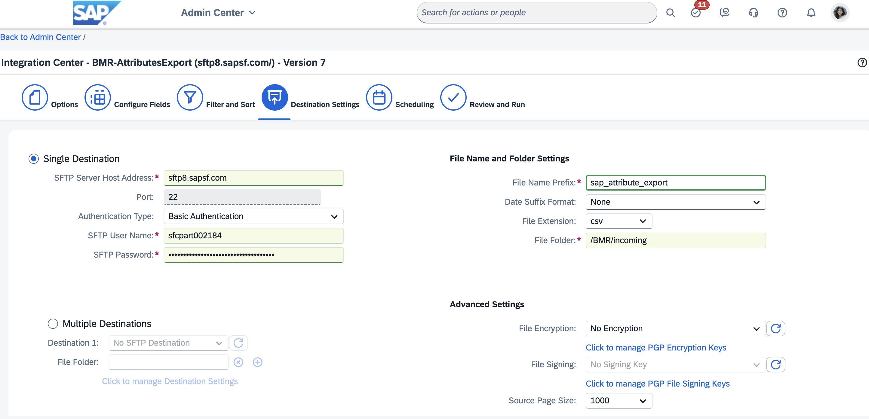 5) Configure SFTP server and file/folder details to export the Attribute data to: