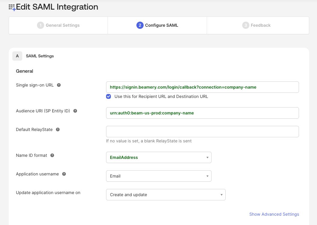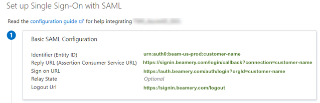 - Please ensure that the new connection sets the NameIDFormat to urn:oasis:names:tc:SAML:1.1:nameid-format:emailAddress. If your previous connection was configured to send a custom SSO user identifier, set the NameIDFormat to urn:oasis:names:tc:SAML:1.1:nameid-format:unspecified instead (see What configuration is required if my Auth0 sends a custom SSO user identifier?). Contact support@beamery.com if you’re unsure which applies.