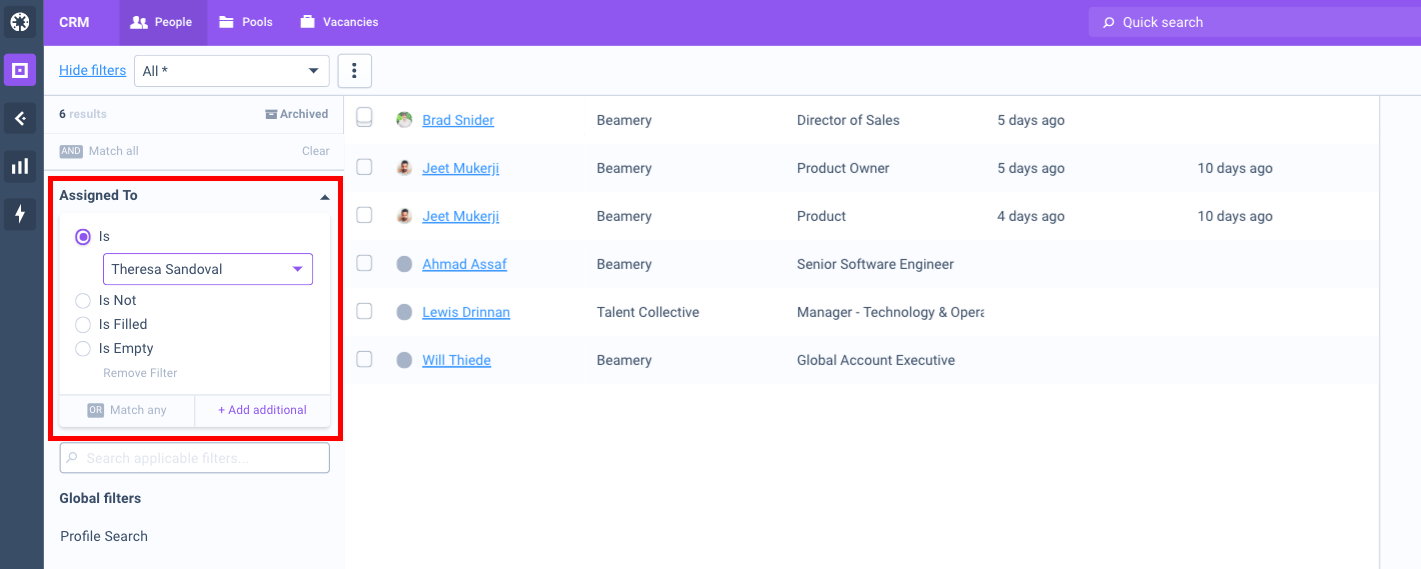 2. To view candidates assigned to you, navigate to "People" within the CRM module. Select the data filter "Assigned To" and select your name in the drop-down options.