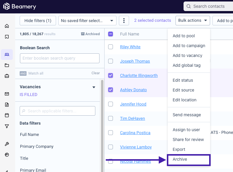1. To delete contacts permanently from your Beamery system, select the Archived option from the filter panel to see the archived profiles in your CRM.