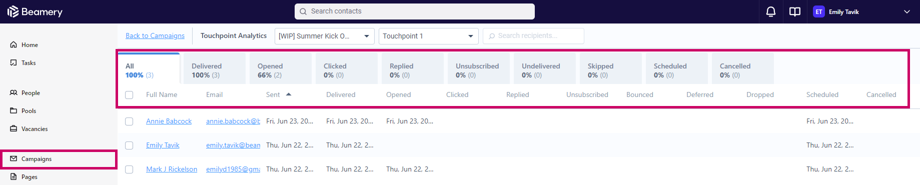 When you look into campaign analytics in Beamery, you will see full reports on how candidates are engaging with your Campaign messages.