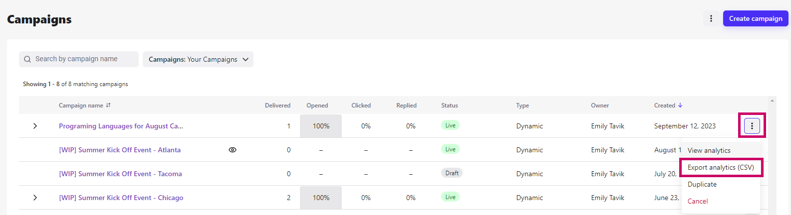 When viewing these analytics in-app, the Campaign's deliverability statuses appear under the first column titled Status. When viewing your Campaign's analytics on a CSV export they will appear in the column under the title Event.