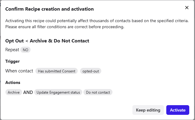For example, when using GDPR filters in conjunction with a scheduled trigger you can run regular purges of contacts who have opted out and have them archived and marked Do Not Contact.