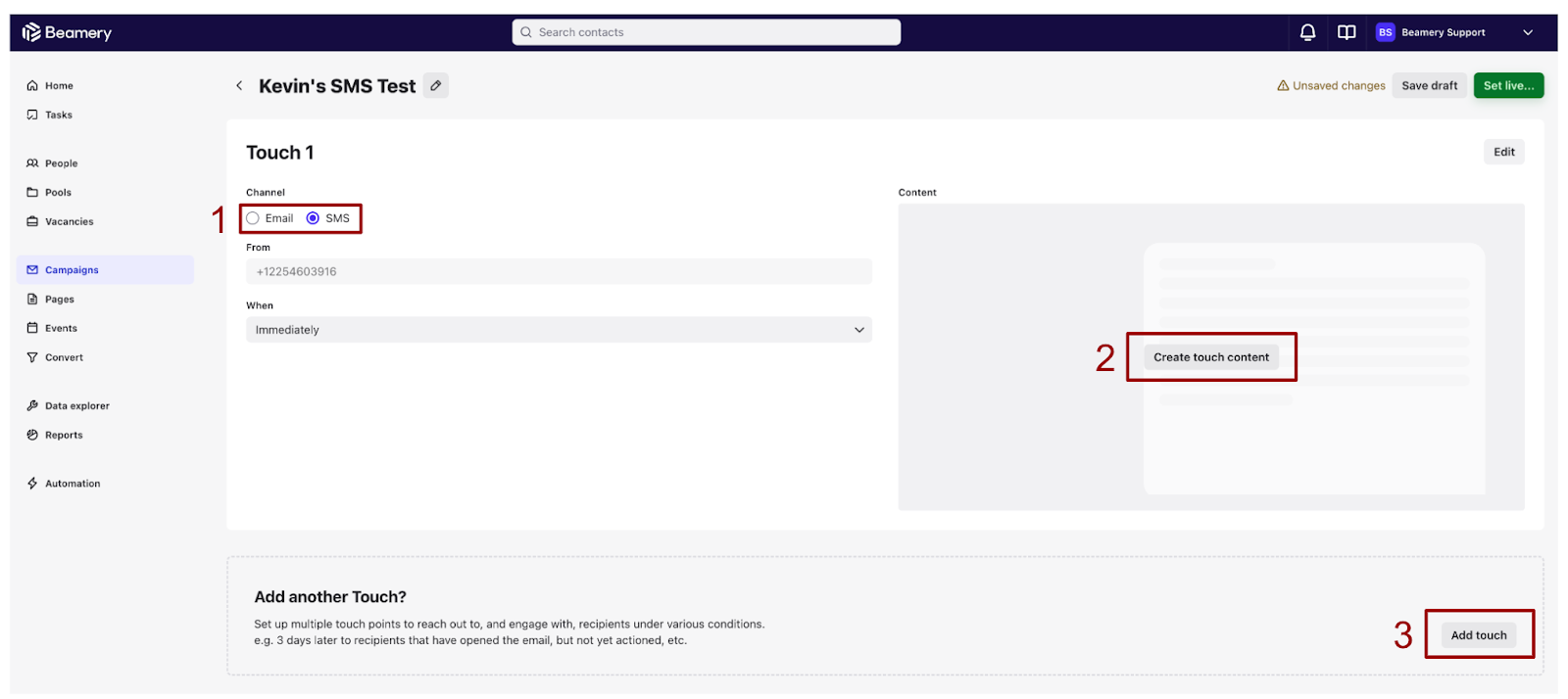 Adding recipients to a bulk SMS campaign as well as creating additional touchpoints follows the same process as adding email recipients as outlined here.