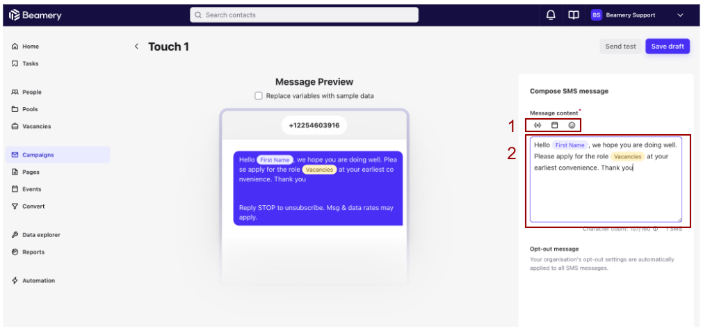 Add Variables, a Meeting Scheduler link, or emojis to messages as you would any plain text Campaign message.